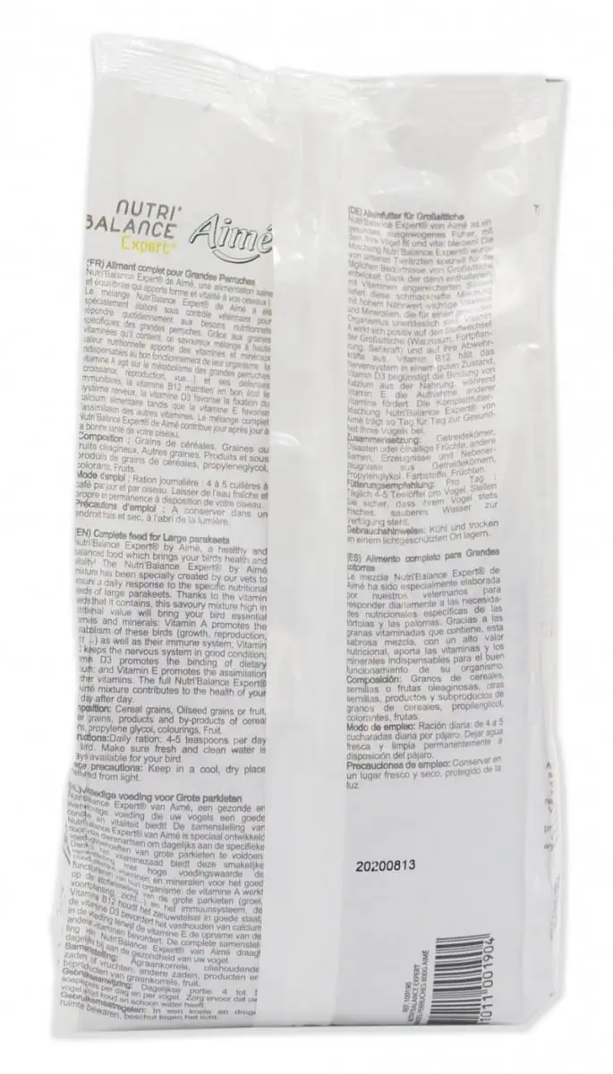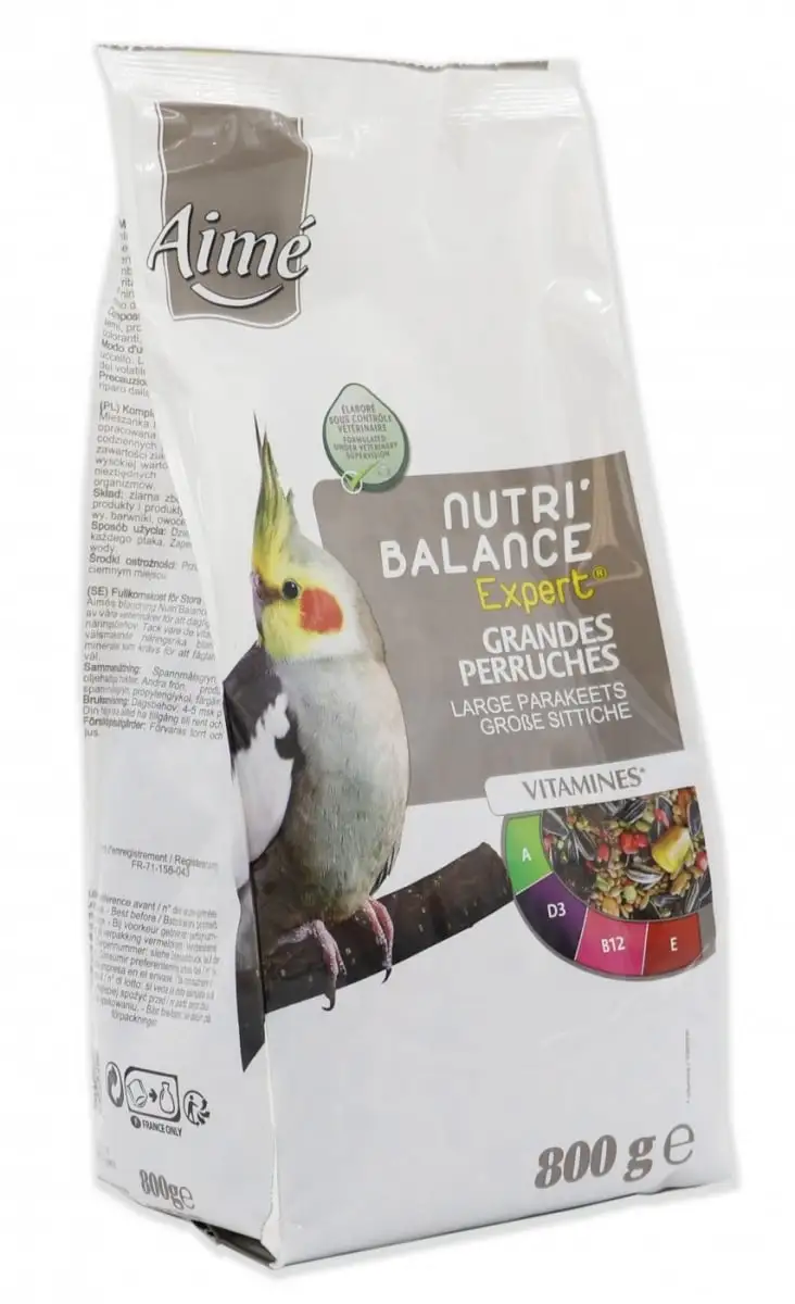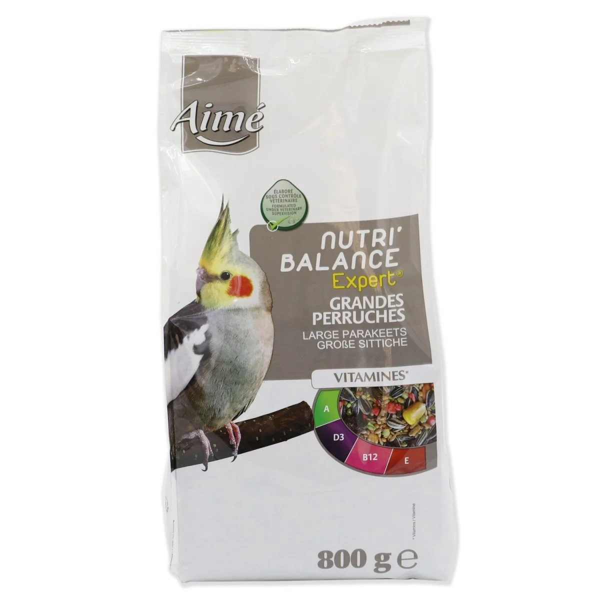 La miscela Nutri’Balance Expert® di Aimé è stata appositamente sviluppata sotto controllo veterinario per soddisfare le esigenze nutrizionali specifiche dei grandi parrocchetti su base giornaliera.