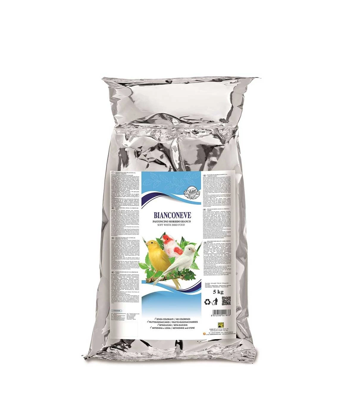 Istruzioni per l’uso. Miscelare 800 g di Bianconeve con 200 g di Nutrient Special, nell’allevamento; usare tal quale nella muta; somministrare 3 giorni alla settimana nel periodo di riposo. Lasciare sempre a disposizione acqua fresca e pulita. Conservare in un luogo fresco e asciutto.