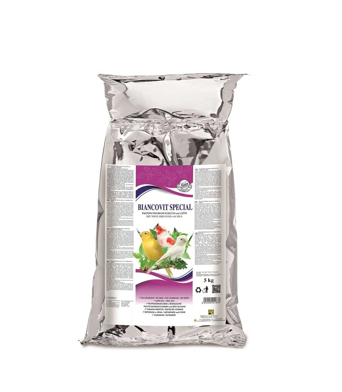 Istruzioni per l’uso: Inumidire durante l’allevamento; miscelare 200 g di BIANCOVIT SPECIAL con 800 g di BIANCOFIORE durante la muta e lo svezzamento dei novelli; somministrare tal quale durante il periodo di riposo. Lasciare sempre a disposizione acqua fresca e pulita. Conservare in luogo fresco e asciutto.