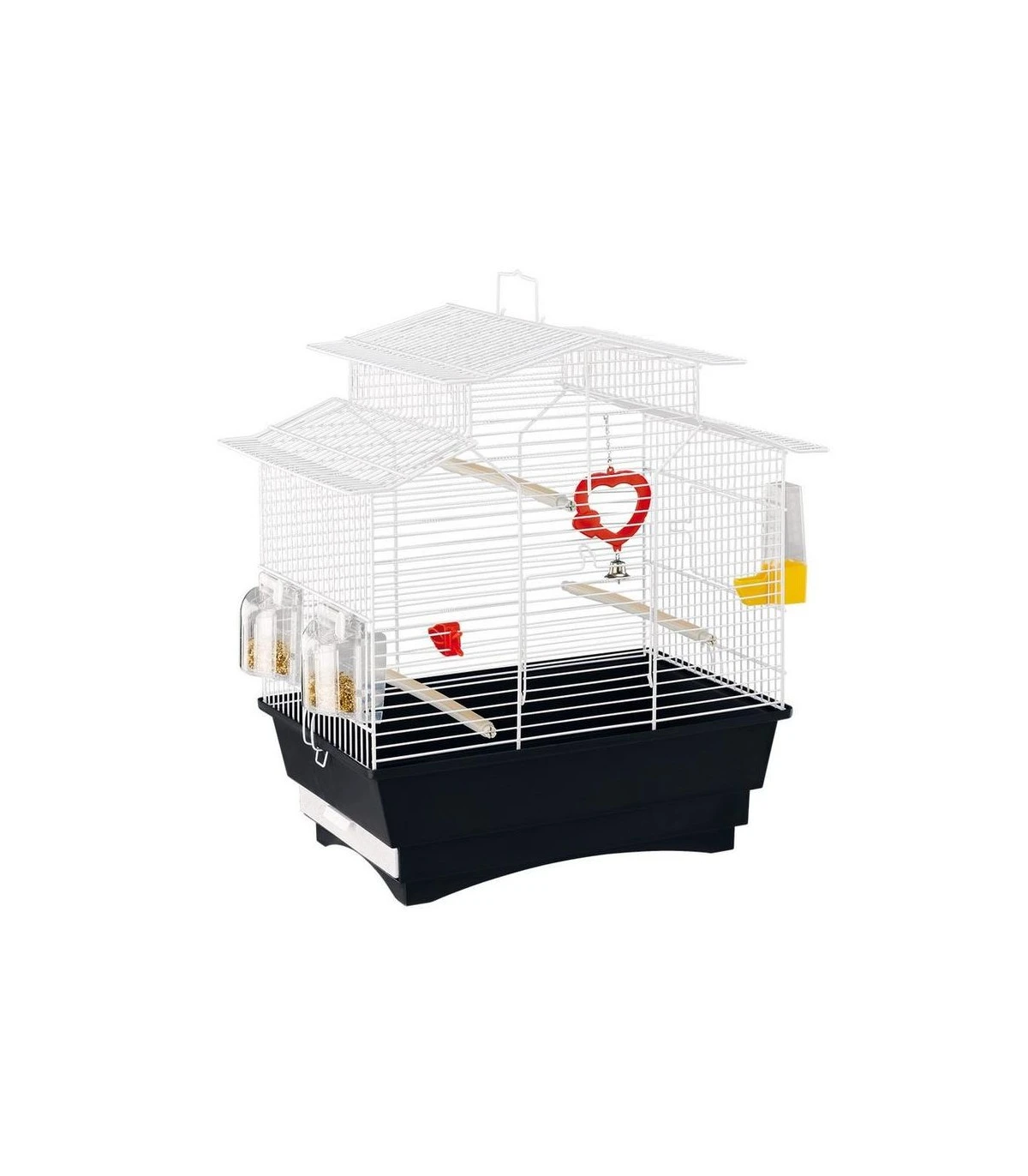 Pagoda è una gabbia di piccole dimensioni ideale per canarini, esotici e altri uccelli. Si distingue per la particolare forma del tetto a più livelli che garantisce grande spazio e libertà di movimento ai volatili; il fondo in plastica ha un’originale forma a gradini ed è completo di cassetto estraibile per la pulizia. La gabbia rettangolare per uccelli Pagoda è corredata di accessori quali beverino in plastica, confortevoli posatoi ricoperti in gomma, pinza per il cibo, gioco con specchio e campanellino e mangiatoie girevoli Brava 1. Pagoda è disponibile anche nella versione con rete metallica ottonata.